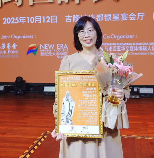 本校传来荣耀喜讯,服务于我校十八载的资深华文科教师郭丽云老师,凭借其在教育领域的无私奉献与卓越表现,荣获备受瞩目的“2025年第十届吴德芳杰出华文教师奖(独立/私立中学组)”殊荣。此项荣誉不仅是对郭老师个人教育热忱与专业精神的至高肯定,更是我校全体师生引以为傲的光荣。