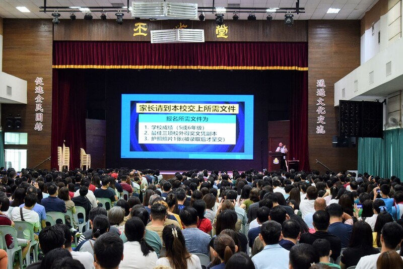 清晨7时,尽管路上细雨纷飞,校园内早已人头攒动。家长们带着孩子陆续抵达,考生则依照编号有序地进入指定考场。早在2025年6月15日,学校已举办校园开放日及办学理念说明会,以便家长与学生提前了解本校的教育方向与校园文化,也有许多家长在说明会当天或更早之前为孩子报名参加此次入学考试。吴维城校长于上午8时30分与11时又在大礼堂展开办学理念说明会,详细讲解本校的办学方针、介绍软硬体设备以及科系等等,并且向家长们阐述录取资格、查询日期、办入学手续等。